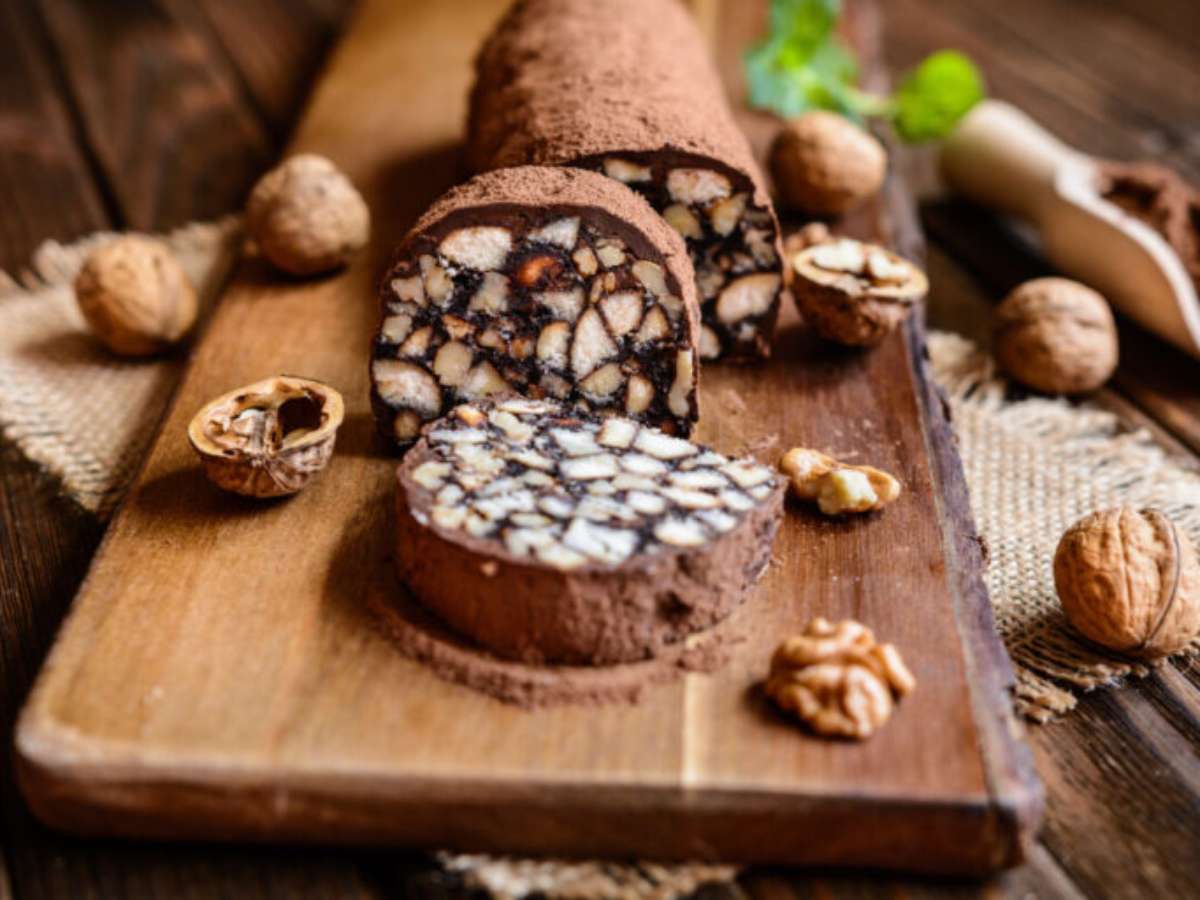 Em uma panela, misture o leite condensado, a manteiga e o cacau. Leve ao fogo médio, mexendo até levantar fervura, derreter a manteiga e engrossar um pouco. Deixe amornar. Quebre os biscoitos grosseiramente com as mãos e misture com o creme. Coloque a massa sobre um pedaço de filme plástico polvilhado com chocolate em pó. Modele um cilindro e feche as pontas, com o plástico. Leve à geladeira por 1 hora ou até endurecer. Retire o plástico, polvilhe com chocolate, corte em fatias e sirva.