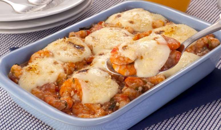É claro que não poderia faltar um gratinado suculento nas receitas com camarão!