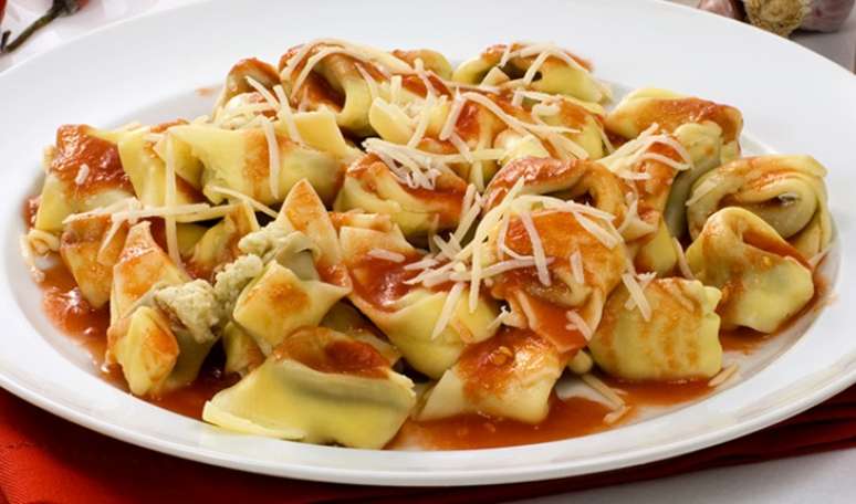 Para o molho, em uma panela, aqueça o azeite em fogo médio e refogue rapidamente o alho por 2 minutos. Coloque os tomates e cozinhe por 3 minutos. Bata no liquidificador e volte para a panela. Tempere com sal e pimenta. Cozinhe o tortelli em água fervente com sal até a massa subir à superfície. Retire com uma escumadeira e arrume em uma travessa. Cubra com o molho e polvilhe com parmesão antes de servir.