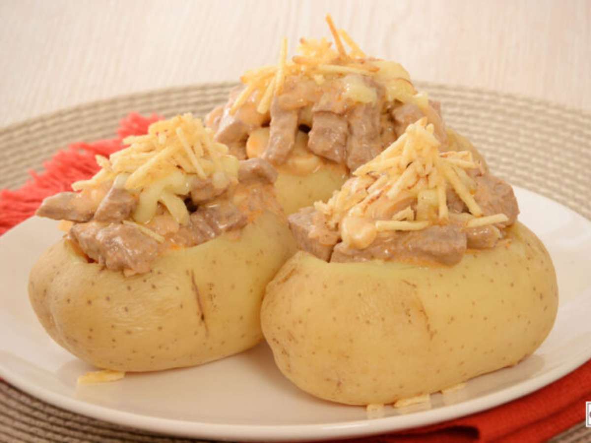 Fure as batatas com um garfo, embrulhe em papel-alumínio, coloque em uma fôrma e leve ao forno médio, preaquecido, por 1 hora. Deixe esfriar. Derreta a manteiga, em fogo médio, e frite a cebola até murchar. Junte a carne e refogue por 2 minutos. Junte o molho inglês, o ketchup, a mostarda e refogue por 3 minutos. Misture o champignon, sal, pimenta, o creme de leite e desligue. Retire uma tampa da batata no sentido do comprimento. Com cuidado, retire a polpa da batata com uma colher (café), preservando uma borda. Divida o recheio entre as batatas, polvilhe com a muçarela, coloque em uma fôrma e leve ao forno alto, preaquecido, por 10 minutos. Polvilhe com batata palha e sirva.