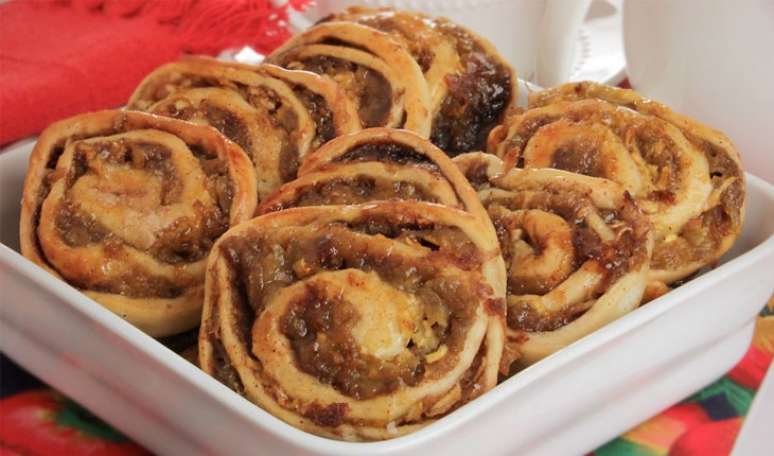 Em uma tigela, dissolva o fermento no leite morno e misture com os ingredientes restantes, sovando a massa até que desgrude das mãos. Se necessário, junte mais farinha. Cubra e deixe descansar por 30 minutos. Abra a massa com um rolo em uma superfície enfarinhada, formando um retângulo grande. Espalhe os ingredientes do recheio misturados, enrole como rocambole e corte em fatias de 3cm. Coloque em uma fôrma untada e enfarinhada, pincele com a gema, polvilhe com açúcar e canela misturados e leve ao forno médio, preaquecido, por 30 minutos ou até assar e dourar levemente. Para a calda, misture os ingredientes em uma panela e leve ao fogo baixo por 10 minutos. Retire os rolinhos do forno e pincele com a calda ainda quente. Deixe amornar e sirva.