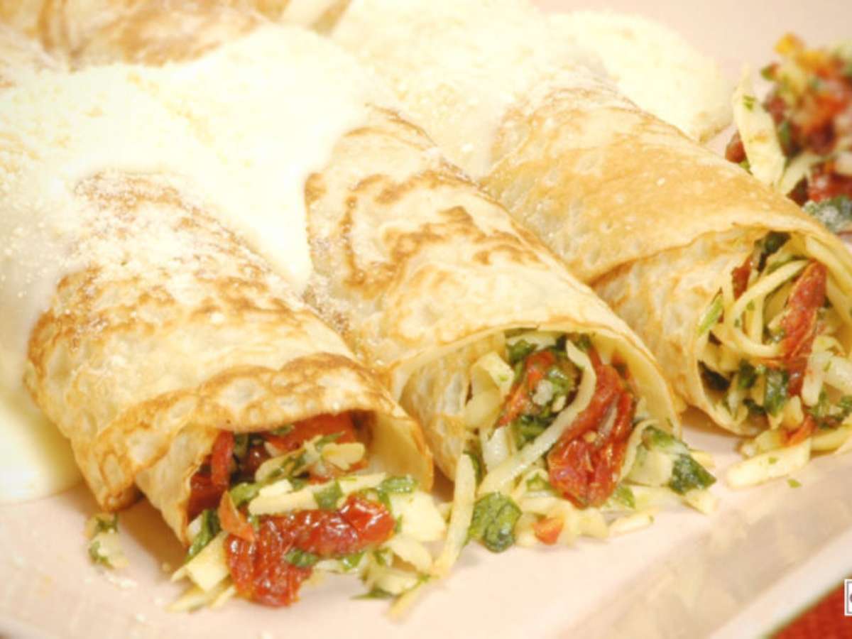 No liquidificador, bata os ingredientes da massa, frite em pequenas porções em frigideira antiaderente dos dois lados por 5 minutos ou até estar cozida e levemente dourada e reserve. Em uma tigela, coloque os ingredientes do recheio e misture. Divida o recheio sobre as massas prontas, enrole cada uma como rocambole e coloque em um refratário untado. Cubra com requeijão e polvilhe com parmesão. Leve ao forno, preaquecido, por 15 minutos ou até gratinar. Retire do forno e sirva em seguida.