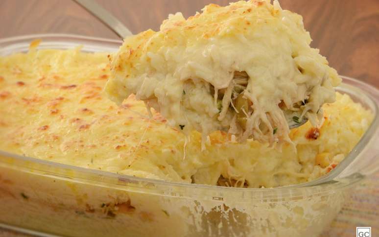 - 3 xícaras (chá) de frango cozido e desfiado