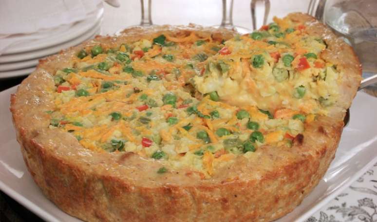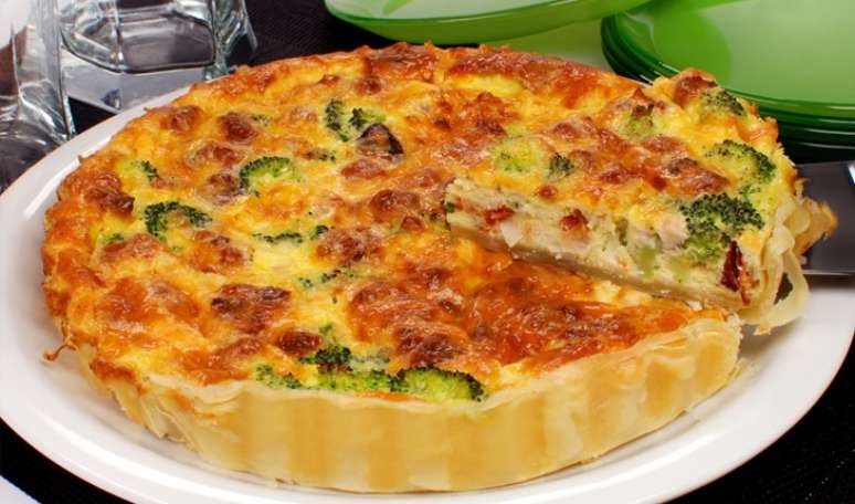 Se quiser receitas de quiche mais tradicionais, uma ótima opção é investir nesse recheio de frango com legumes!