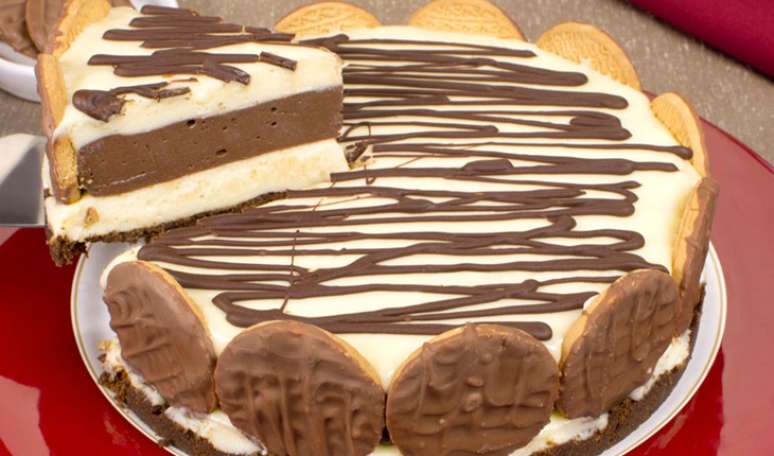 No liquidificador, bata a gelatina restante com o chocolate branco derretido e o restante do leite condensado e do creme de leite até ficar cremoso. Despeje metade do creme branco sobre a massa e leve à geladeira por 15 minutos. Espalhe o creme de chocolate meio amargo e volte à geladeira por 15 minutos. Espalhe o creme branco restante e volte à geladeira por 3 horas ou até firmar. Desenforme, decore toda a lateral com o biscoito Calipso e decore a superfície com o chocolate meio amargo derretido. Sirva.