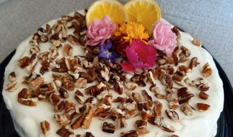 Leve para assar em forno preaquecido a 180 graus por aproximadamente 40 minutos ou até formar uma leve crosta dourada. Faça o teste do palito para verificar o ponto. Espere esfriar e desenforme. Para a cobertura, bata na batedeira o cream cheese, o creme de leite fresco, o açúcar até o ponto chantilly. Adicione as raspas de laranja. Espalhe a cobertura sobre o bolo e enfeite com nozes picadas.