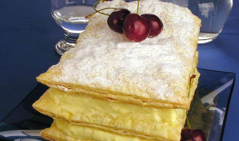 Corte a massa em retângulos de 20cm x 30cm. Leve ao forno preaquecido em assadeira por 15 minutos, ou até que esteja assada. Retire do forno e deixe esfriar. Leve ao fogo os ingredientes do recheio, mexendo sempre, por 10 minutos, ou até que vire um creme. Retire do fogo e deixe esfriar, mexendo sempre para que não crie película por cima. Coloque uma massa em uma travessa de servir, uma camada de creme, outra de massa, outra de creme e por fim outra de massa. Polvilhe o açúcar de confeiteiro por cima. Se desejar, decore com cerejas.