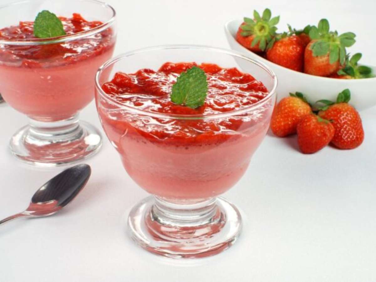 Prepare a gelatina de acordo com as informações da embalagem e bata no liquidificador com o iogurte e a ricota até ficar homogêneo. Despeje em taças para sobremesa individuais e leve à geladeira por 3 horas. Para a calda, leve todos os ingredientes ao fogo baixo, mexendo algumas vezes, até formar uma geleia. Desligue e deixe esfriar. Retire as sobremesas da geladeira, divida a calda entre elas, decore com hortelã e sirva em seguida.