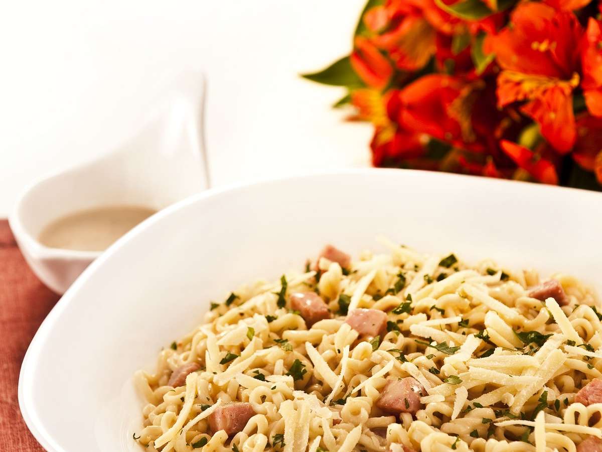 Cozinhe o macarrão instantâneo sabor bacon conforme as instruções da embalagem e reserve. Coloque em uma panela a manteiga, o presunto e deixe fritar um pouco, junte o ovo batido e vá mexendo até fritar todos os ingredientes. Coloque a fritada em cima do macarrão e polvilhe queijo ralado.