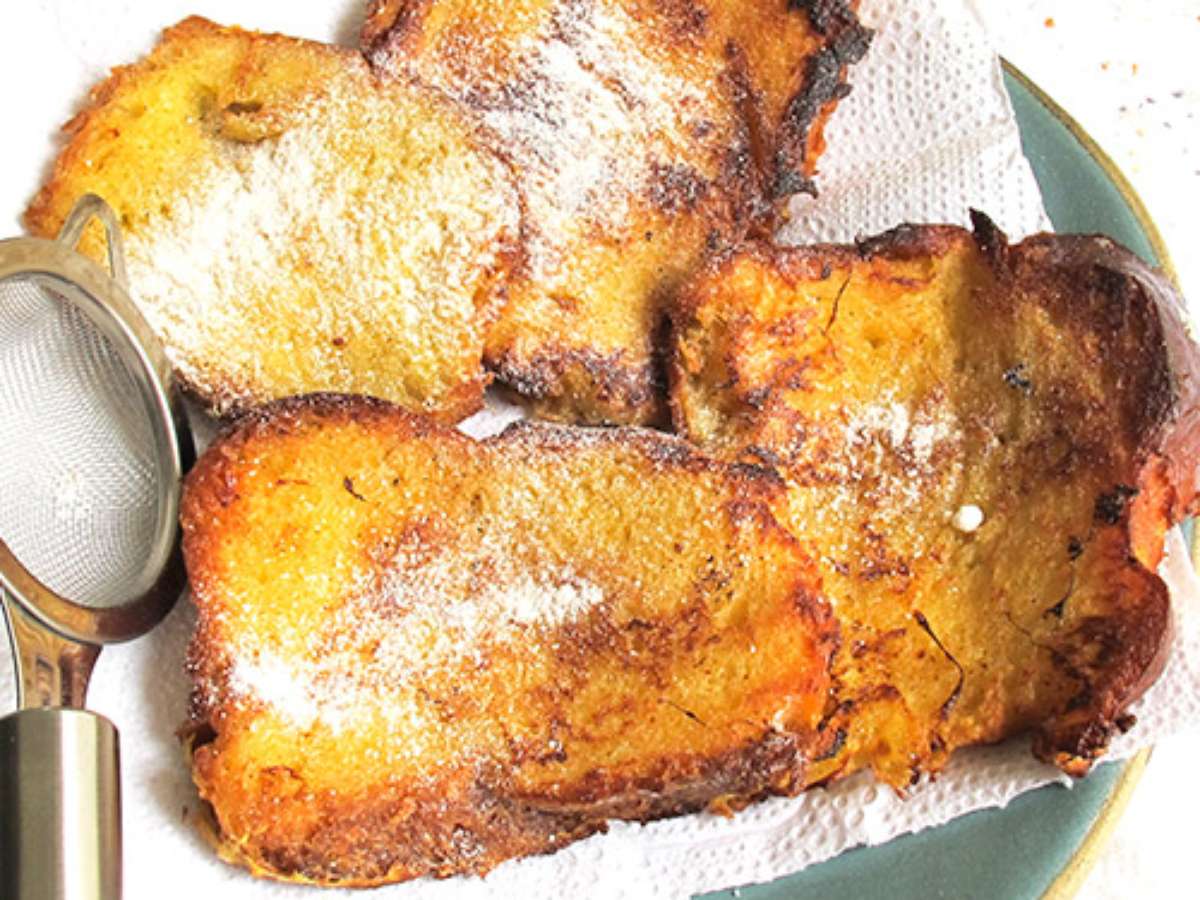- 2. Coloque a manteiga para derreter em uma frigideira no fogo bem baixo. Passe rapidamente os dois lados de cada fatia de pão na mistura de ovos e leite. Se achar que as fatias de pão estão um pouco secas, vire-as mais uma vez na mistura.