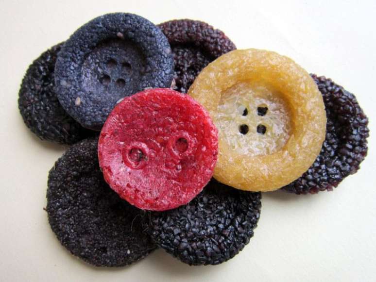 Botões, fivelas, bolsas e golas para camisas fazem parte das criações da estilista de origem inglesa, que trabalha com restos de alimentos que ela mesma pede a seus familiares e amigos durante semanas antes de começar seu processo de produção.