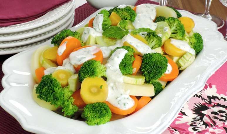 Para o molho, misture bem todos os ingredientes e reserve. Cozinhe a mandioquinha, a cenoura, a batata, a abobrinha e o brócolis no vapor até ficarem al dente. Tempere com sal e deixe esfriar. Transfira para uma travessa, regue com o molho de iogurte e sirva em seguida.