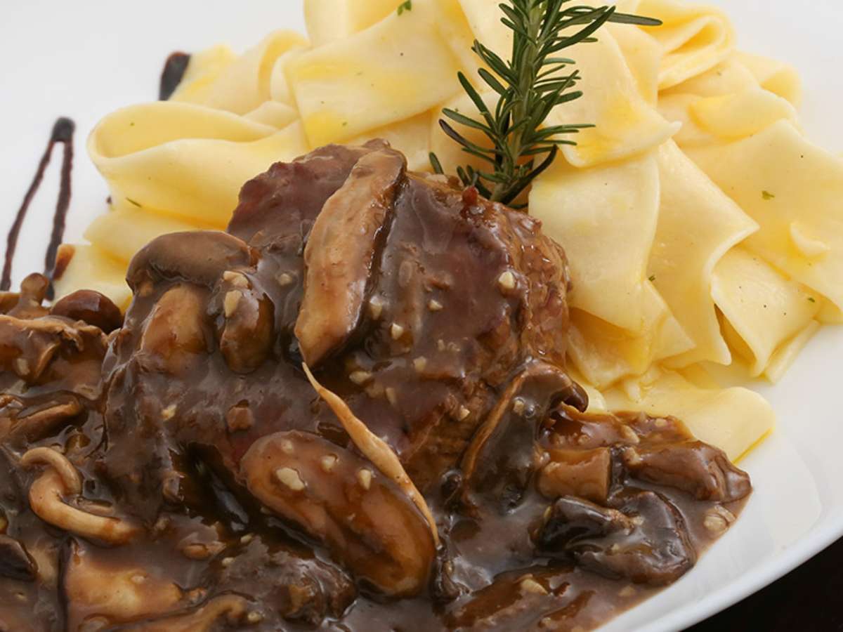 Veneza: medalhão de filé mignon, shitake, cogumelo paris e funghi sechi acompanhado de pappardelle amanteigado