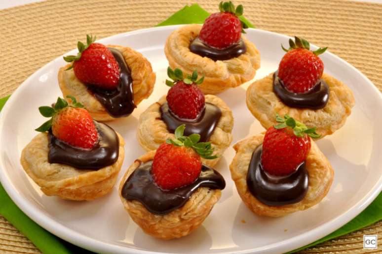 Abra a massa folhada conforme as instruções da embalagem e corte em círculos pequenos. Forre forminhas de empada com os disquinhos de massa e coloque uma ao lado da outra em uma fôrma grande. Leve ao forno médio, preaquecido, por 10 minutos ou até assar e firmar.