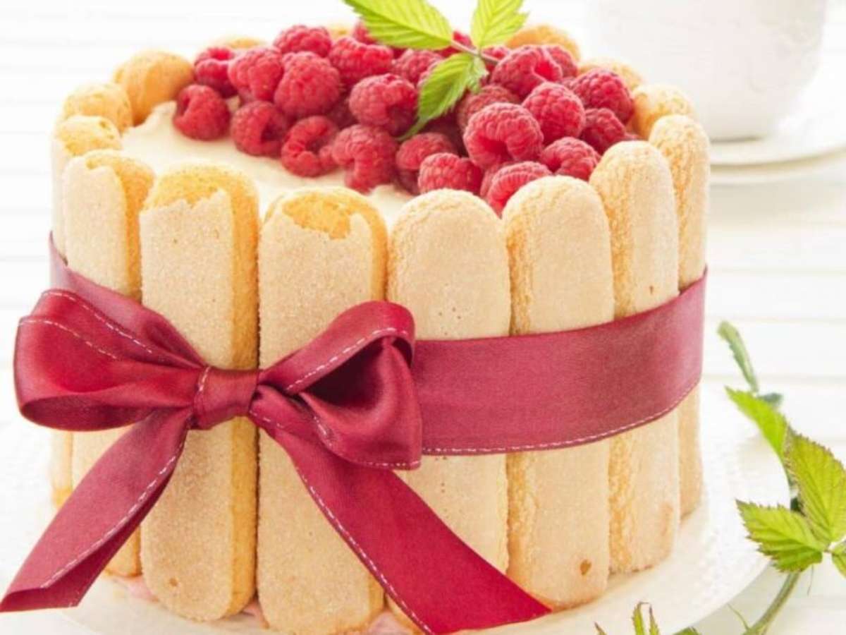 Para o recheio, em uma batedeira, bata o cream cheese, a manteiga e o açúcar até ficar homogêneo. Em um prato para servir, coloque uma das massas, espalhe 1/3 do recheio e sobre ele metade da geleia. Coloque outra massa, espalhe mais 1/3 do recheio e a geleia restante. Disponha a massa restante, decore toda a lateral com os biscoitos champanhe e amarre com uma fita para fixar. Sobre o bolo, espalhe o recheio restante, espalhe as framboesas e decore com folhas de hortelã. Sirva gelado ou em temperatura ambiente.