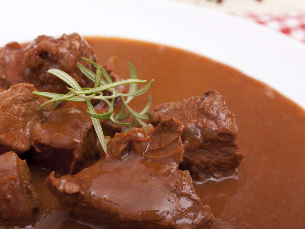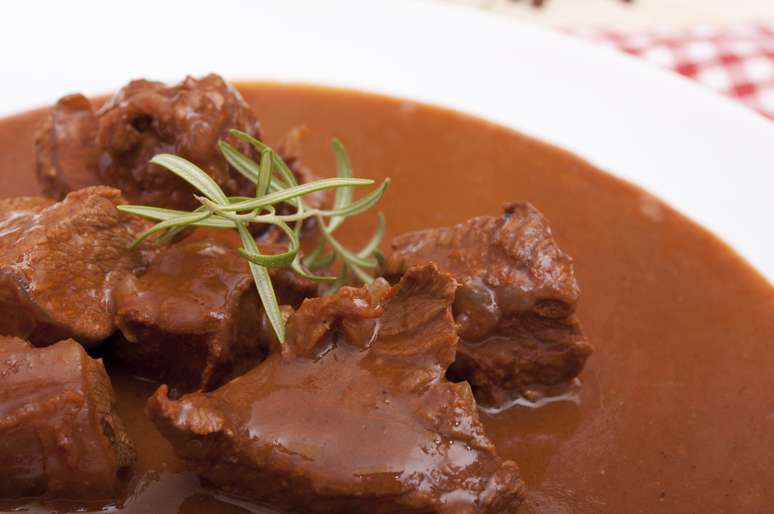Modo de preparo: coloque uma panela de água para ferver. Coloque o óleo em outra panela grande e refogue a cebola até amarelar. Dê a primeira salgada. Aumente o fogo e coloque a carne para dourar. Junte uma colher de sopa de páprica doce e mexa bem. Cubra a carne e mais 5 cm da panela com água fervente, abaixe o fogo. Acerte o sal novamente, cubra e cozinhe em fogo baixo até a carne ficar macia. Junte a cenoura, salsão, maço de salsinha, batata e a páprica picante. Acrescente água fervente, se necessário, e cozinhe até que os vegetais amaciem. Antes de servir, acerte o sal de novo e junte o resto da páprica doce.