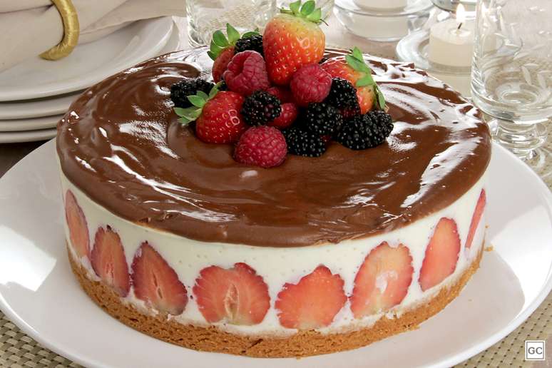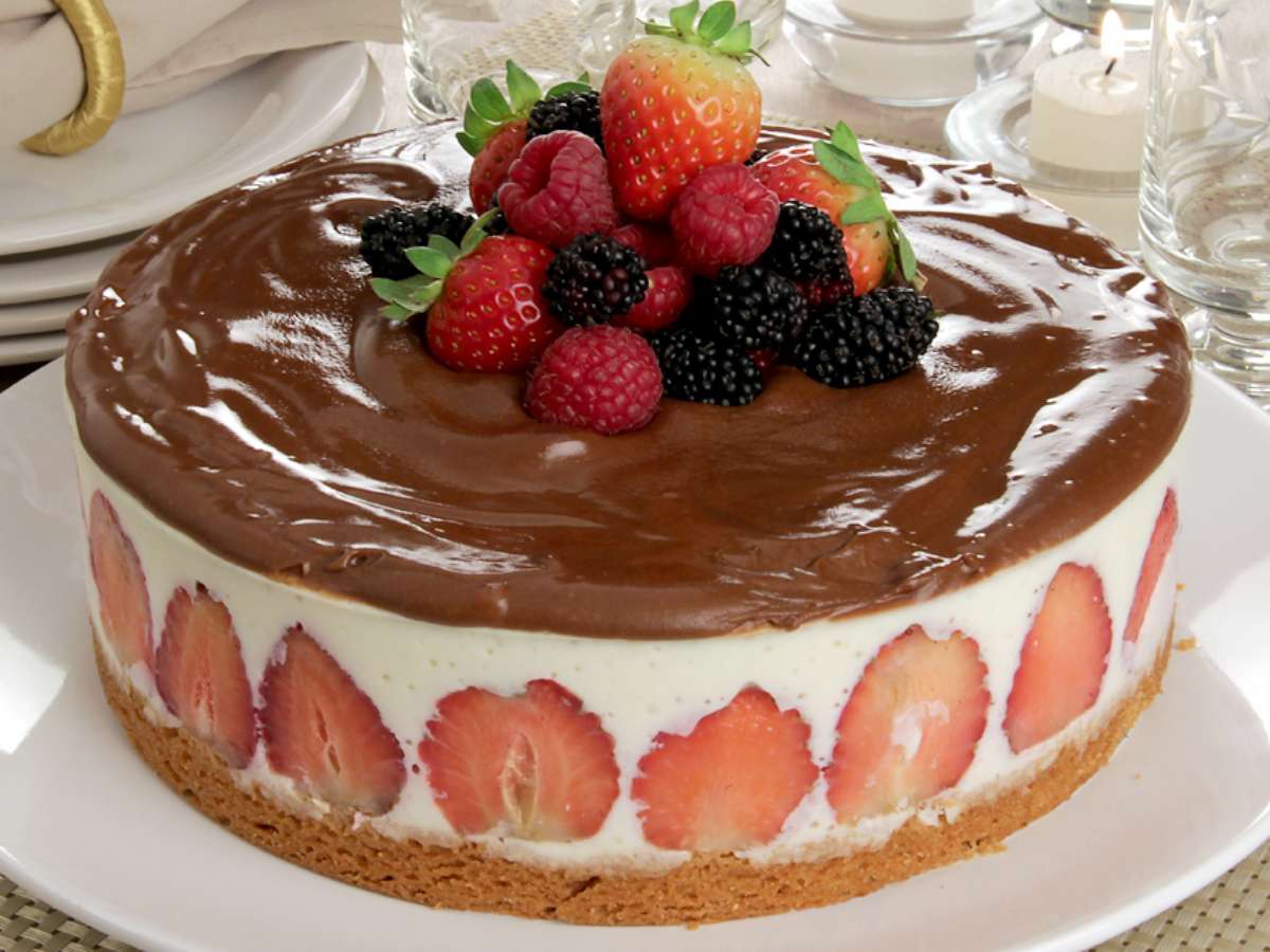 Espalhe sobre o recheio e volte à geladeira por mais 2 horas. Retire, desenforme, decore com frutas vermelhas e sirva.