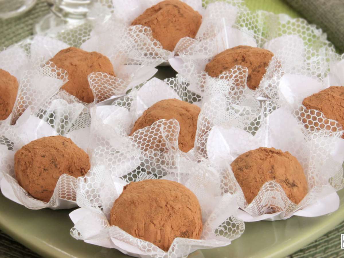 Modele bolinhas com as mãos, passe pelo cacau em pó, disponha em forminhas de papel e sirva.