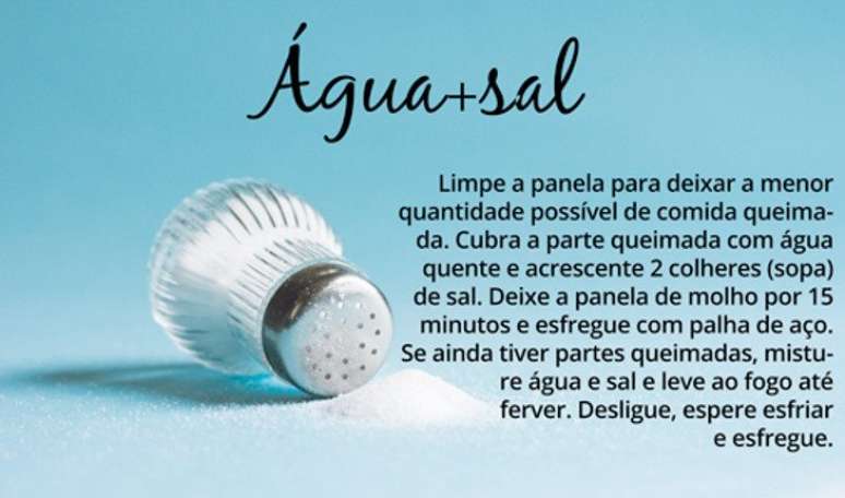 O sal também é produto poderoso para limpar aquela panela que ficou queimada na hora de cozinhar o almoço!