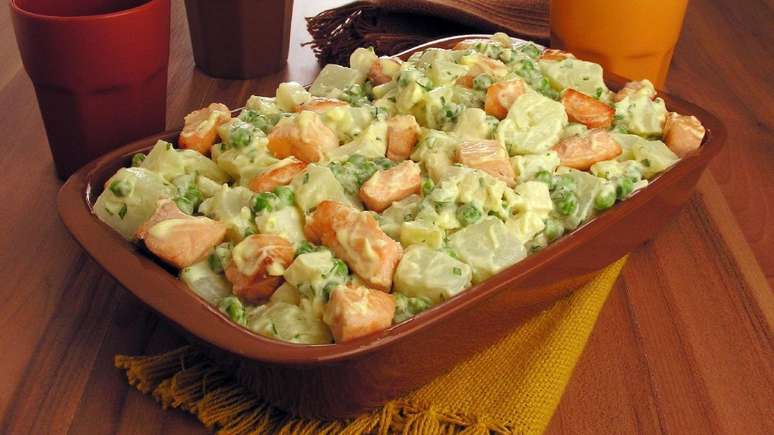 - Coloque na tigela junto com a batata, o palmito, a ervilha, a maionese, o requeijão, a salsa picada, o suco e raspas de limão, tempere com sal e misture.
