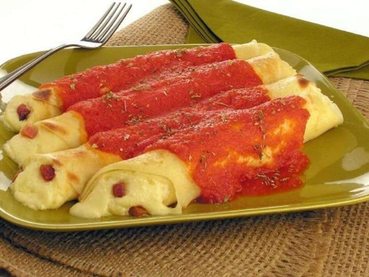 - Divida o recheio sobre as massas da panqueca e enrole como rocambole
