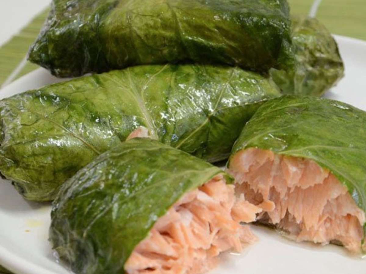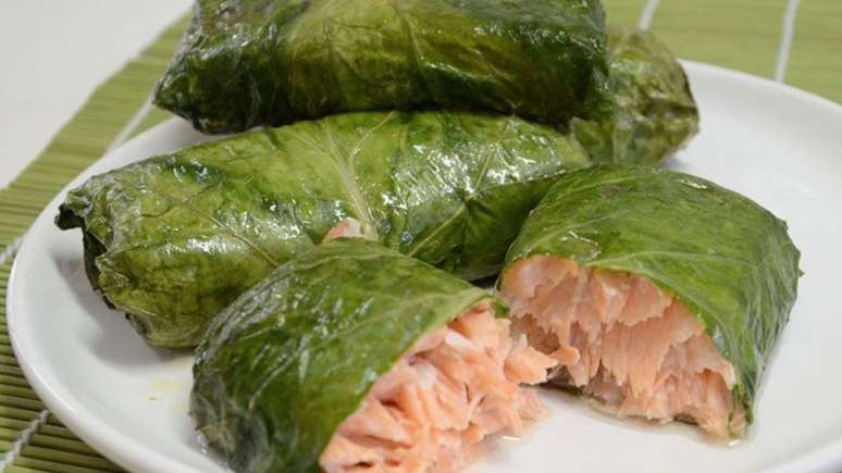 - Coloque um pedaço de salmão sobre cada folha de couve, na extremidade.