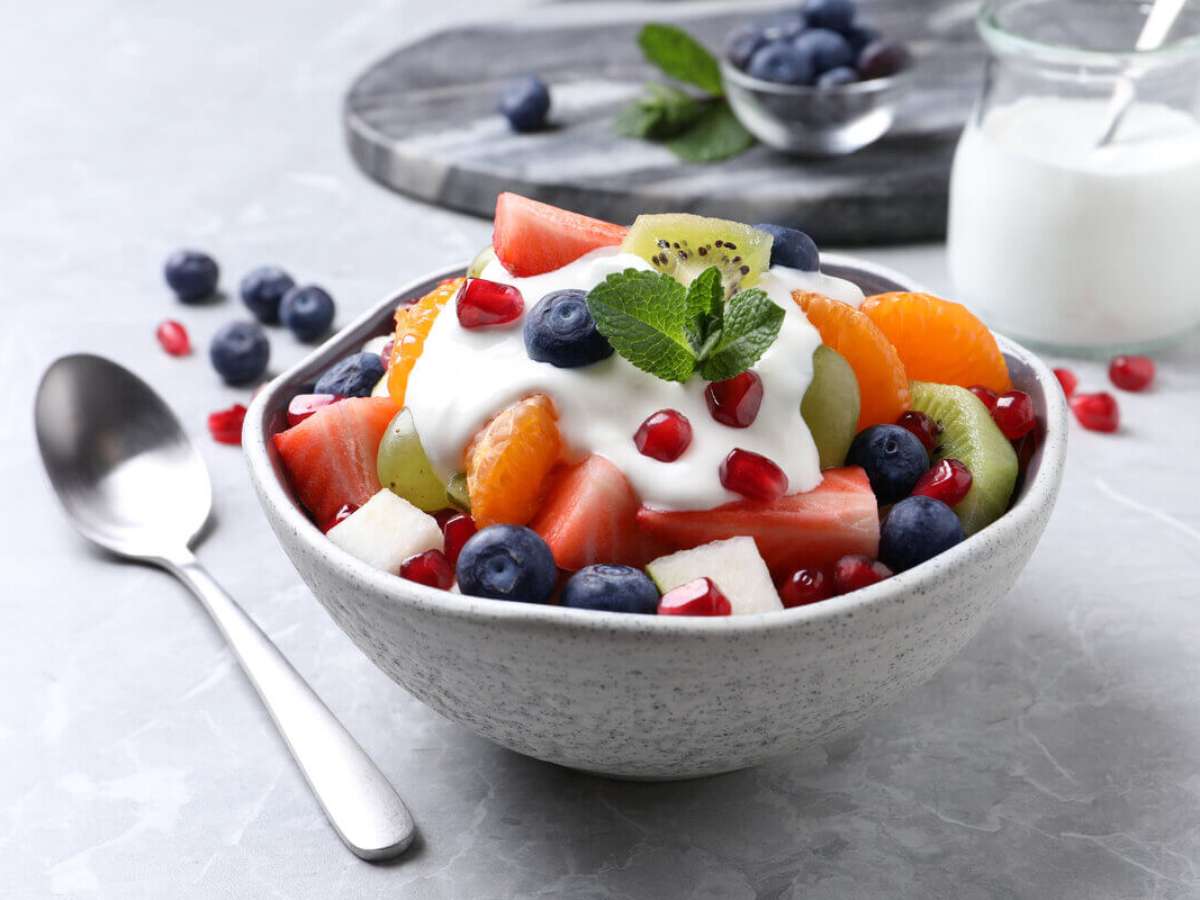 - 1 xícara de chá de salada de frutas com 1/2 pote de iogurte light