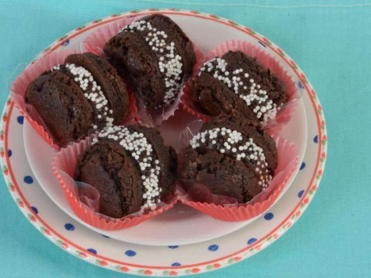 - Monte o doce usando 2 discos de brownie e o recheio de brigadeiro.