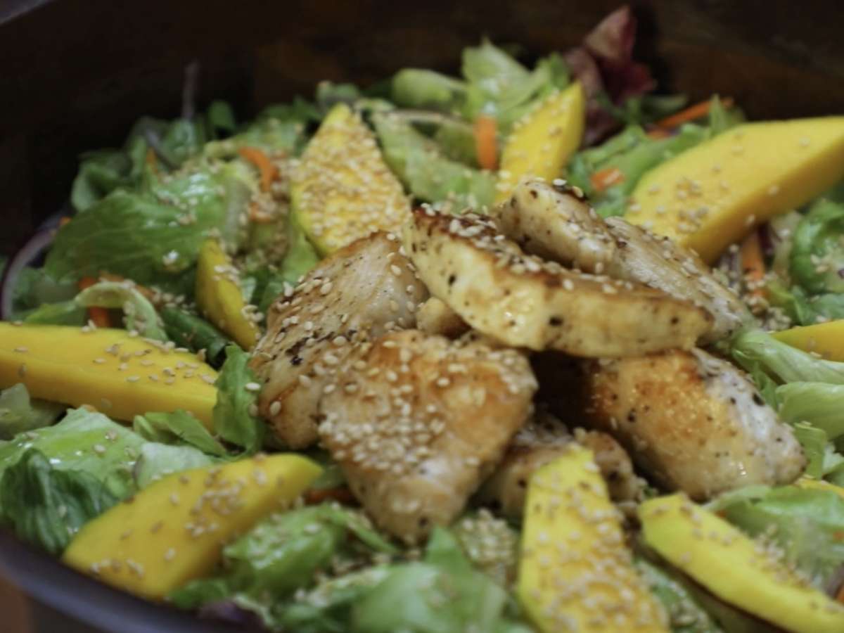 Comece temperando as tiras do peito de frango com sal e pimenta do reino. Em um frigideira bem quente coloque um fio de azeite e doure as tirinhas, reserve em um prato. Em uma tigela coloque o alface, o pepino em rodelas finas, a cenoura ralada, a cebola e tempere com o molho. Por cima coloque as fatias de manga e o frango já frio. Finalize com o gergelim e sirva.