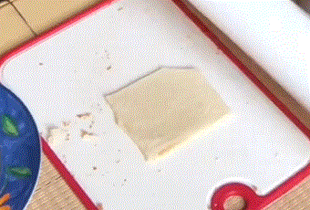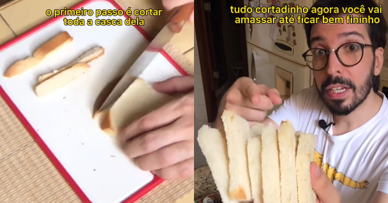 O segundo passo é amassar as fatias do pão descascado. Sendo assim, passe um rolo ou, caso não tenha um rolo, use um objeto cilíndrico como um copo ou garrafa para amassar. Caso use um objeto de vidro, todo cuidado é pouco para evitar acidentes.