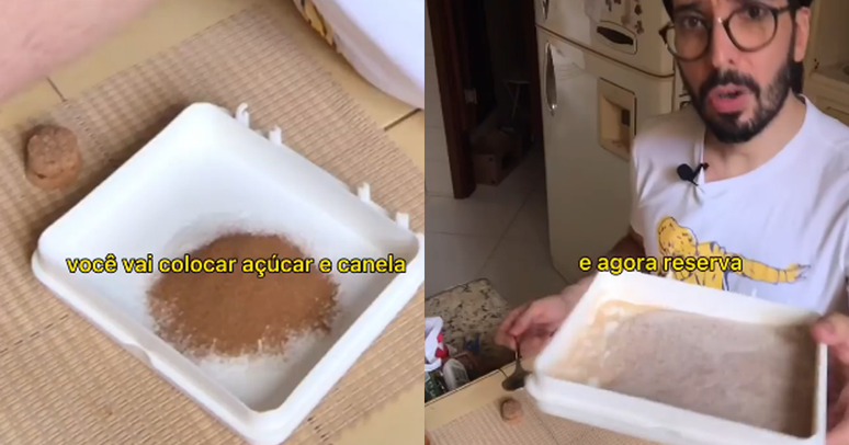 O quinto passo é fazer uma farofinha de açúcar e canela em pó. Misture partes iguais desses ingredientes em um recipiente raso como uma assadeira ou um prato e reserve.