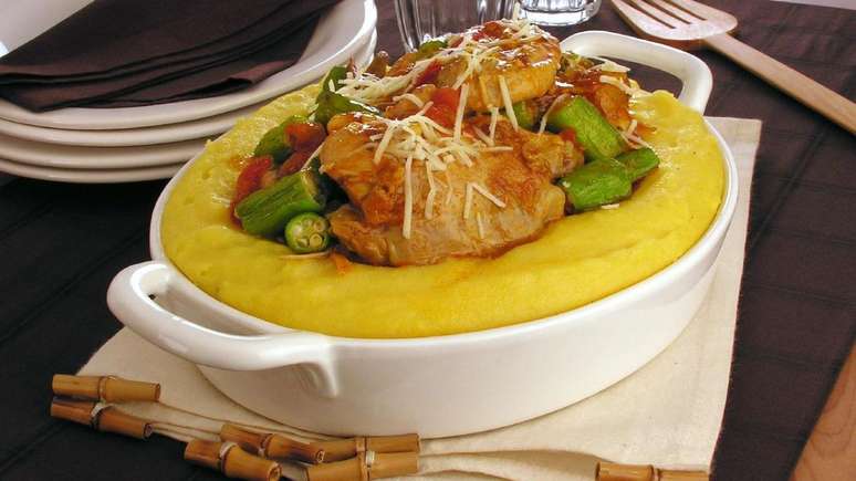 Frango com quiabo e polenta - Foto: Stela HandaTempo: 1h30