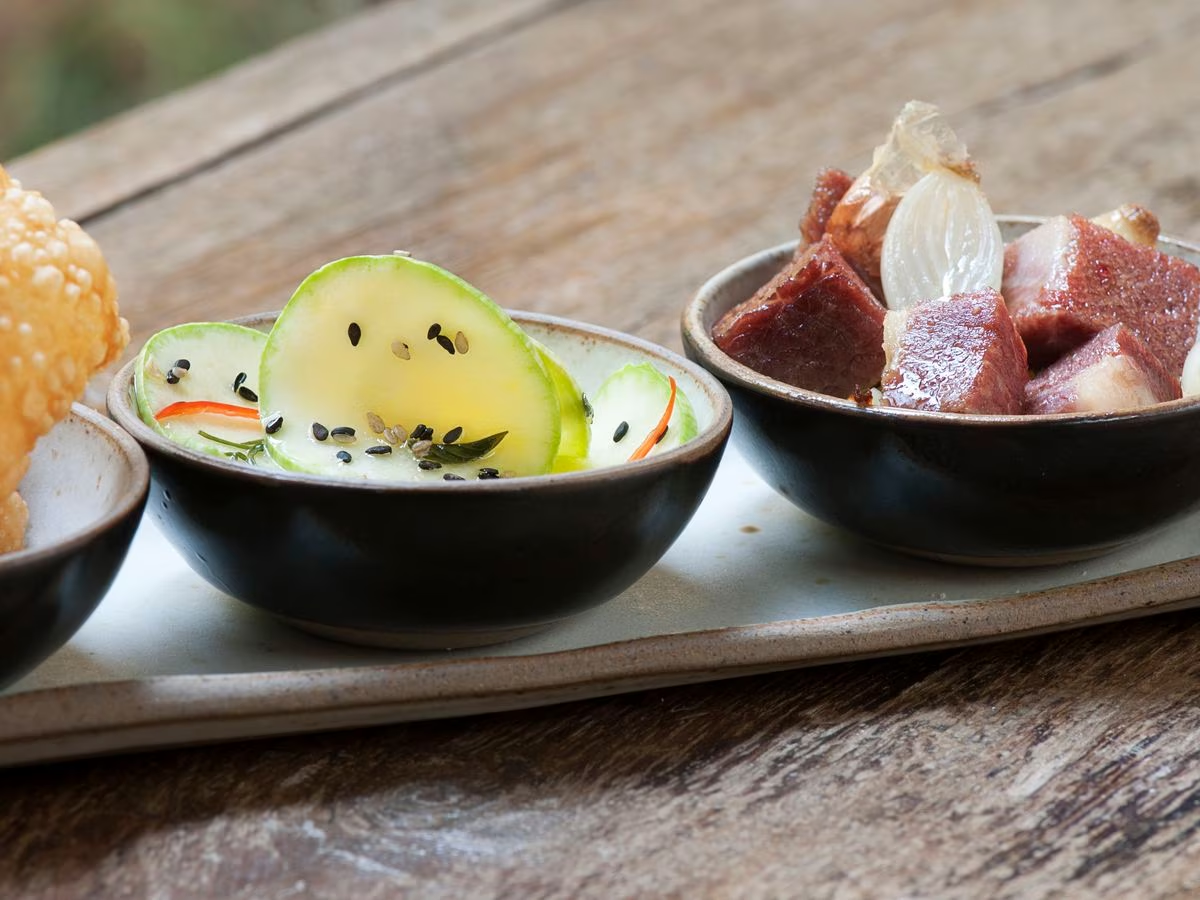 Para compartilhar, ou mesmo quem quiser comer só, a comissão de frente (R$ 55 para duas pessoas; R$ 75 para três pessoas) contém pastel de camarão, marinada de vegetais, carne seca confitada em manteiga de garrafa e queijo coalho com melado.