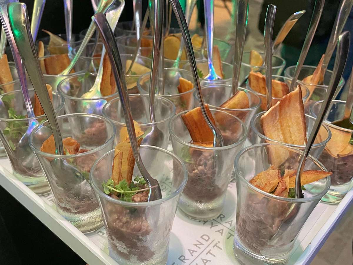 Em pequenas porções, foram servidos aperitivos como ceviche, tartar de filé-mignon, salada caprese e croissants.