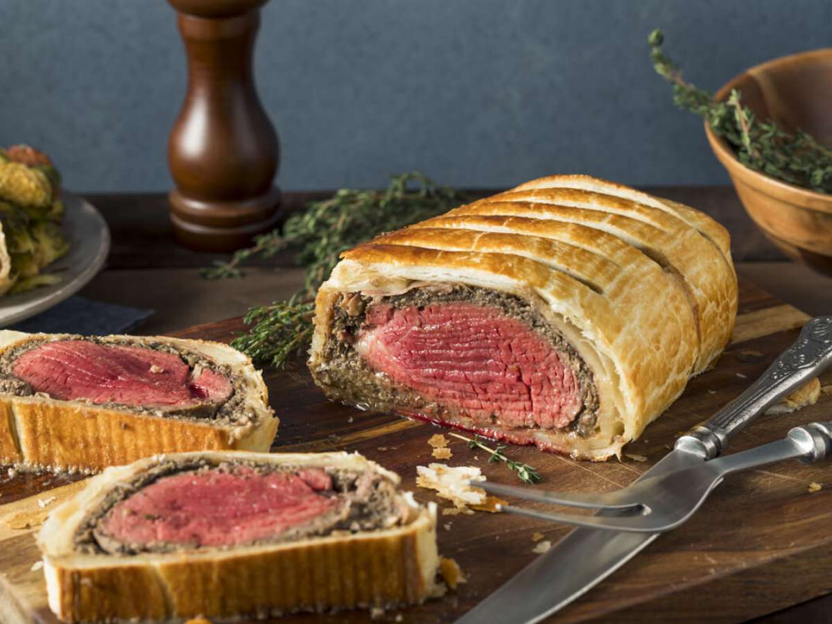 Em uma tigela, tempere o filé-mignon com o alecrim, o tomilho, a pimenta-do-reino moída, o sal e deixe descansar por 1 hora. Em uma frigideira, coloque um fio de azeite e sele o filé de todos os lados. Deixe a carne esfriar por 1 hora. Na mesma frigideira, refogue os cogumelos picados com o azeite, a cebola e tempere com sal e pimenta-do-reino. Deixe cozinhar até secar todo o líquido. Em um processador, passe o cogumelo para formar uma pasta e reserve.