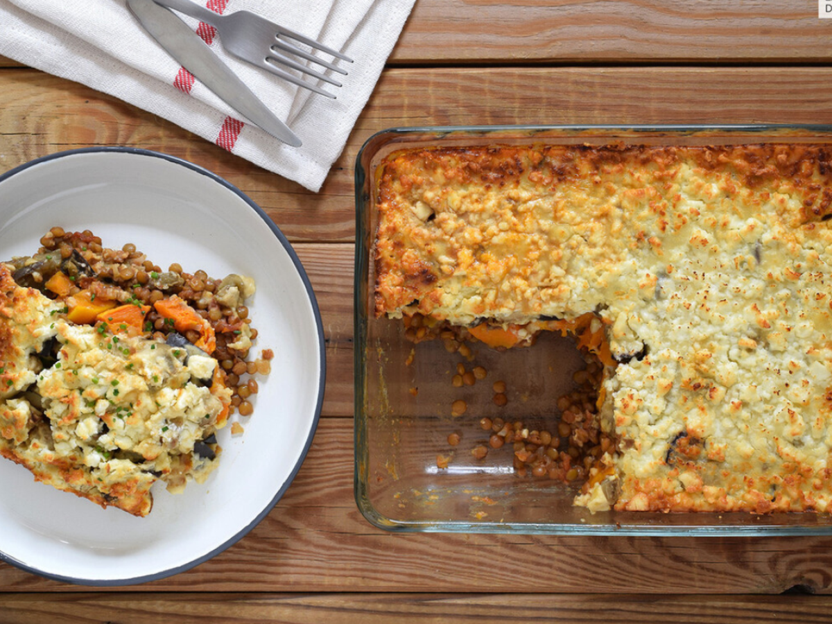 A combinação de lentilhas, abóbora, berinjela, molho bechamel e queijo é excepcional