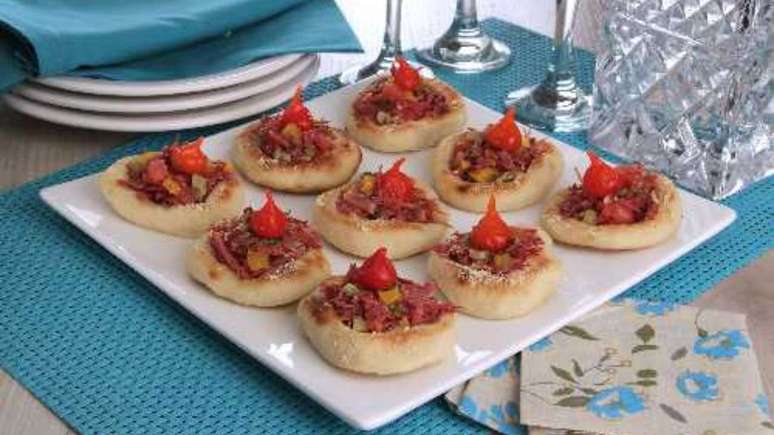 O recheio único leva carne bovina desfiada, tomates, pimentões e até azeitona! Com essa mistura saborosa, vai ser difícil parar de comer! Mas não se preocupe, pode chamar toda a galera para aproveitar, porque a receita rende até 40 unidades! O resultado é maravilhoso!