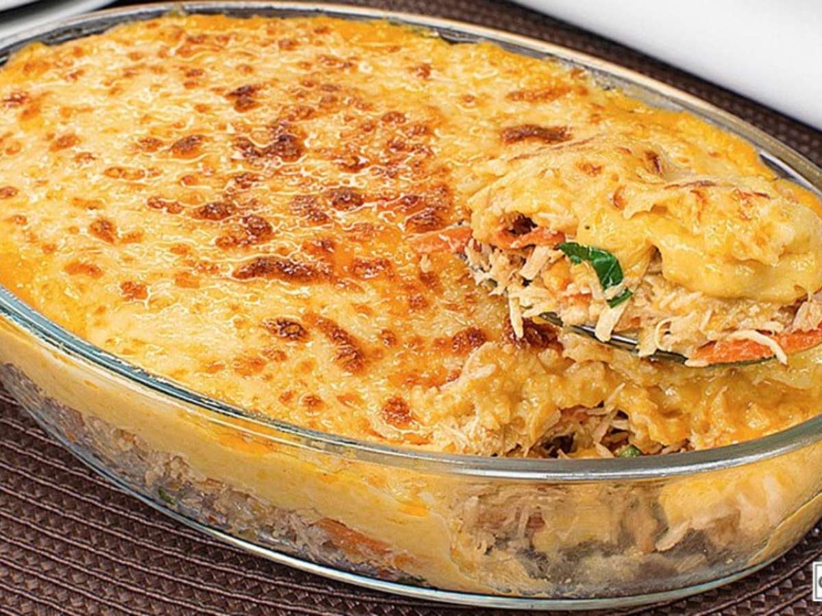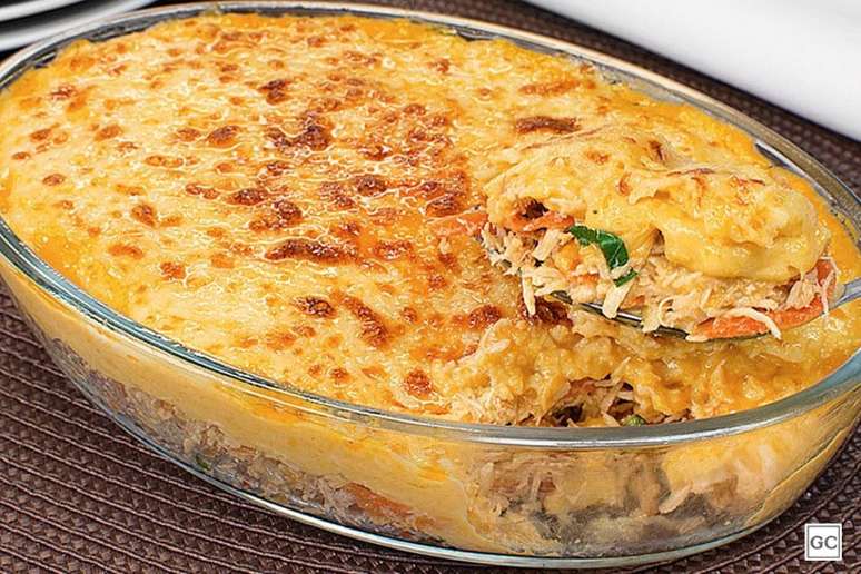 - Em um refratário grande untado, coloque o refogado de frango e cubra com o creme de milho.