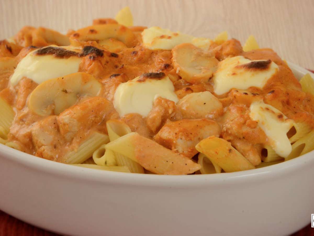 - Transfira para um refratário e cubra com o estrogonofe restante.