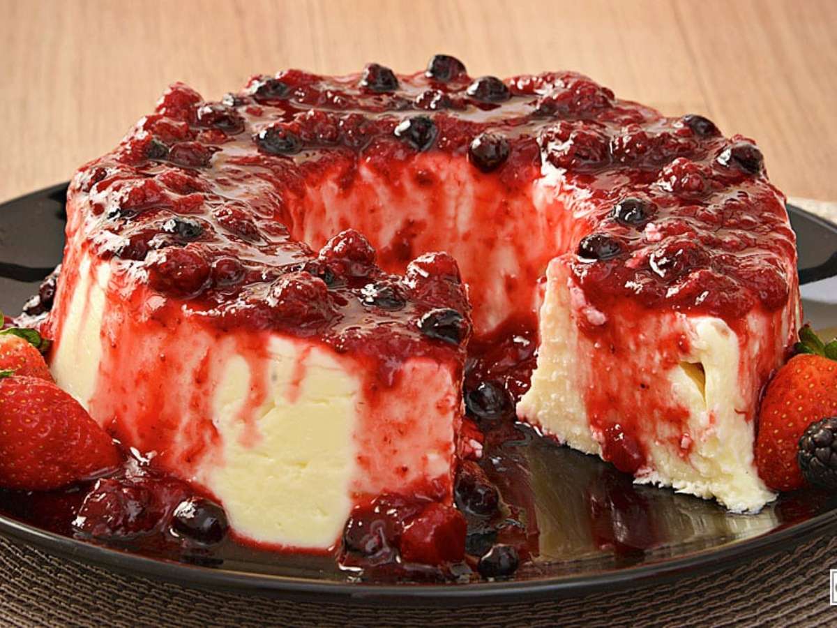 - Desenforme, regue com a calda, decore com frutas vermelhas e sirva em seguida.