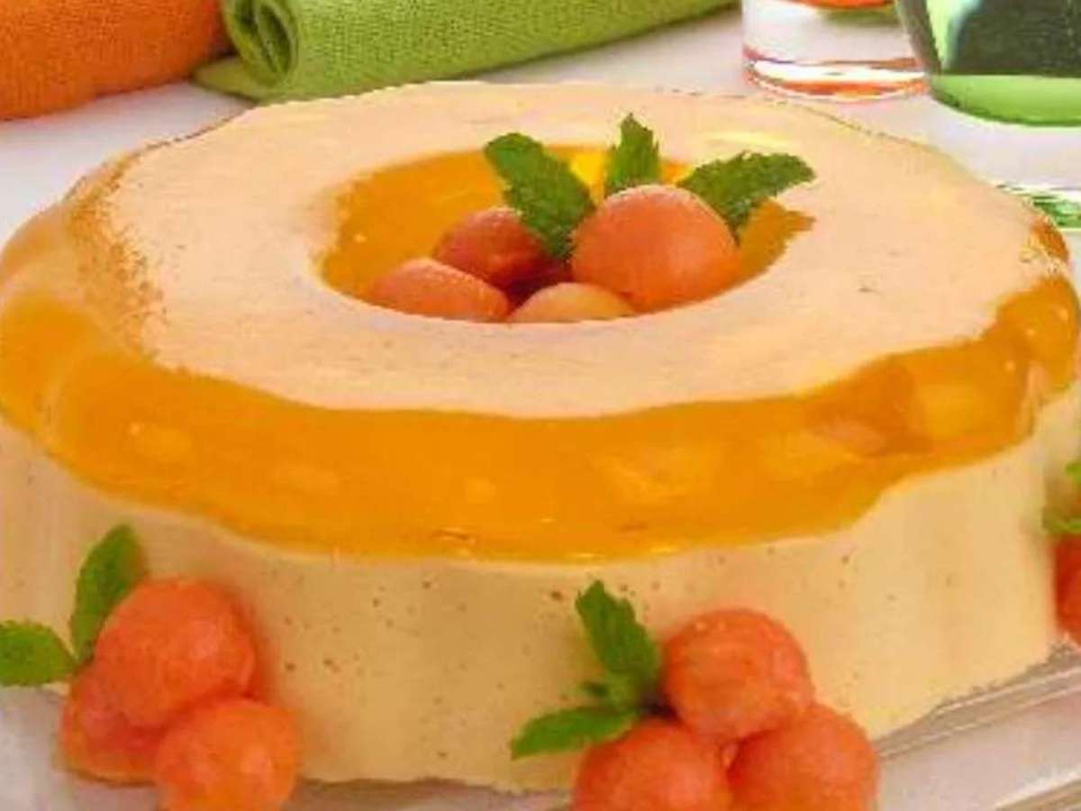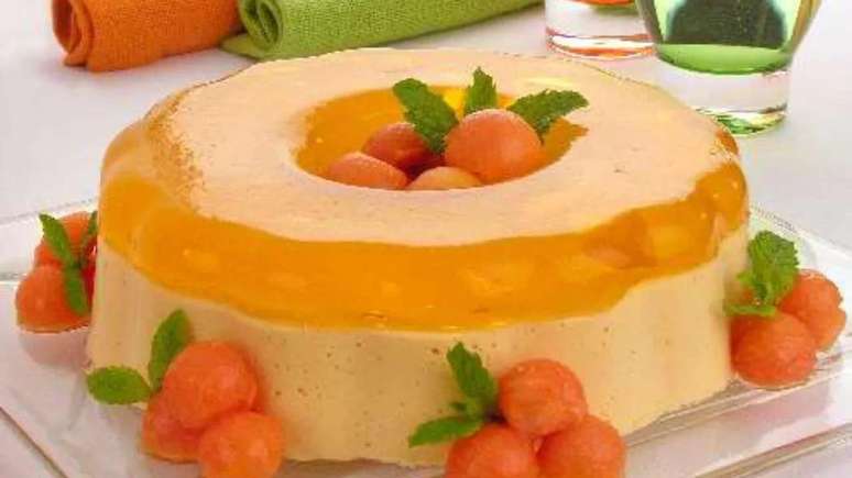 - Vire sobre um prato e decore com bolinhas de mamão (use um boleador) e folhas de hortelã.
