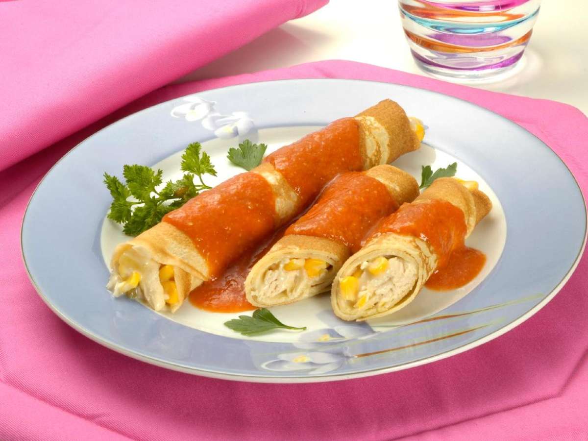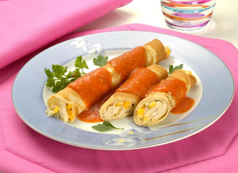 - Recheie com o frango, enrole a panqueca e decore com folhas de salsa.