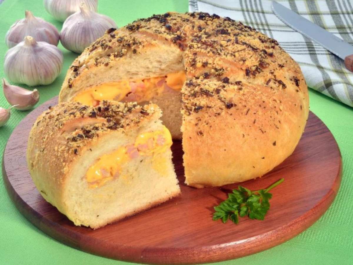 - Pincele a gema, polvilhe o alho e leve ao forno médio, preaquecido, por 35 minutos ou até dourar.