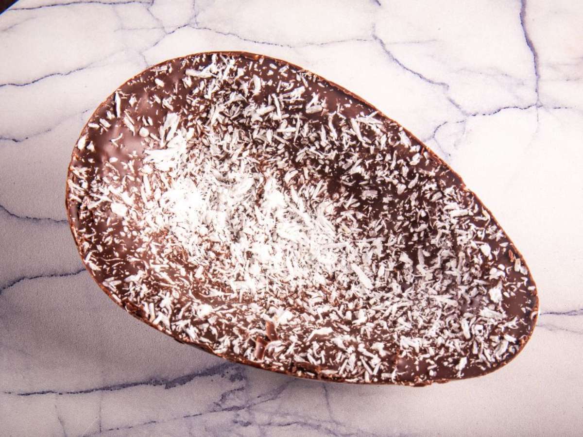 - Derreta o chocolate em banho-maria e, com um pincel próprio para chocolate, espalhe uma camada em metade de uma forma própria para ovo de Páscoa de 500g.
