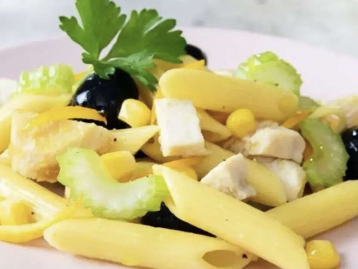 Penne rigate com azeitonas pretas, milho e frango grelhado: veja como fazer aqui