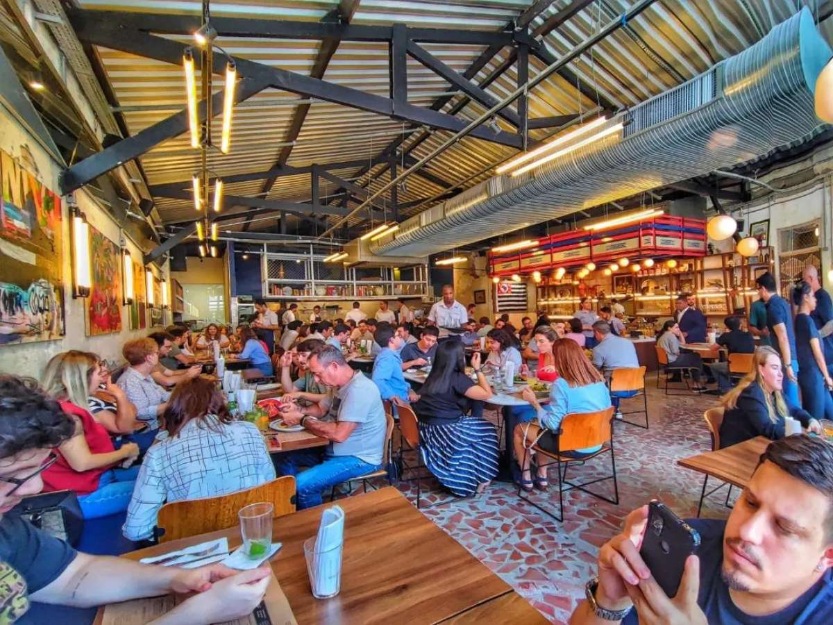 O ambiente é animado, leve, divertido - um enorme galpão de pé direito alto com iluminação natural, cozinha aberta, com pinturas coloridas na parede de um lado e o bar no outro.