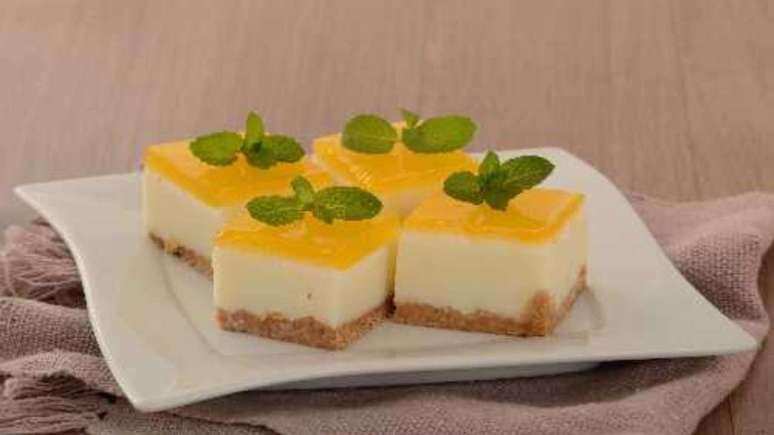 - Desenforme, corte em quadrados, decore com hortelã e sirva.
