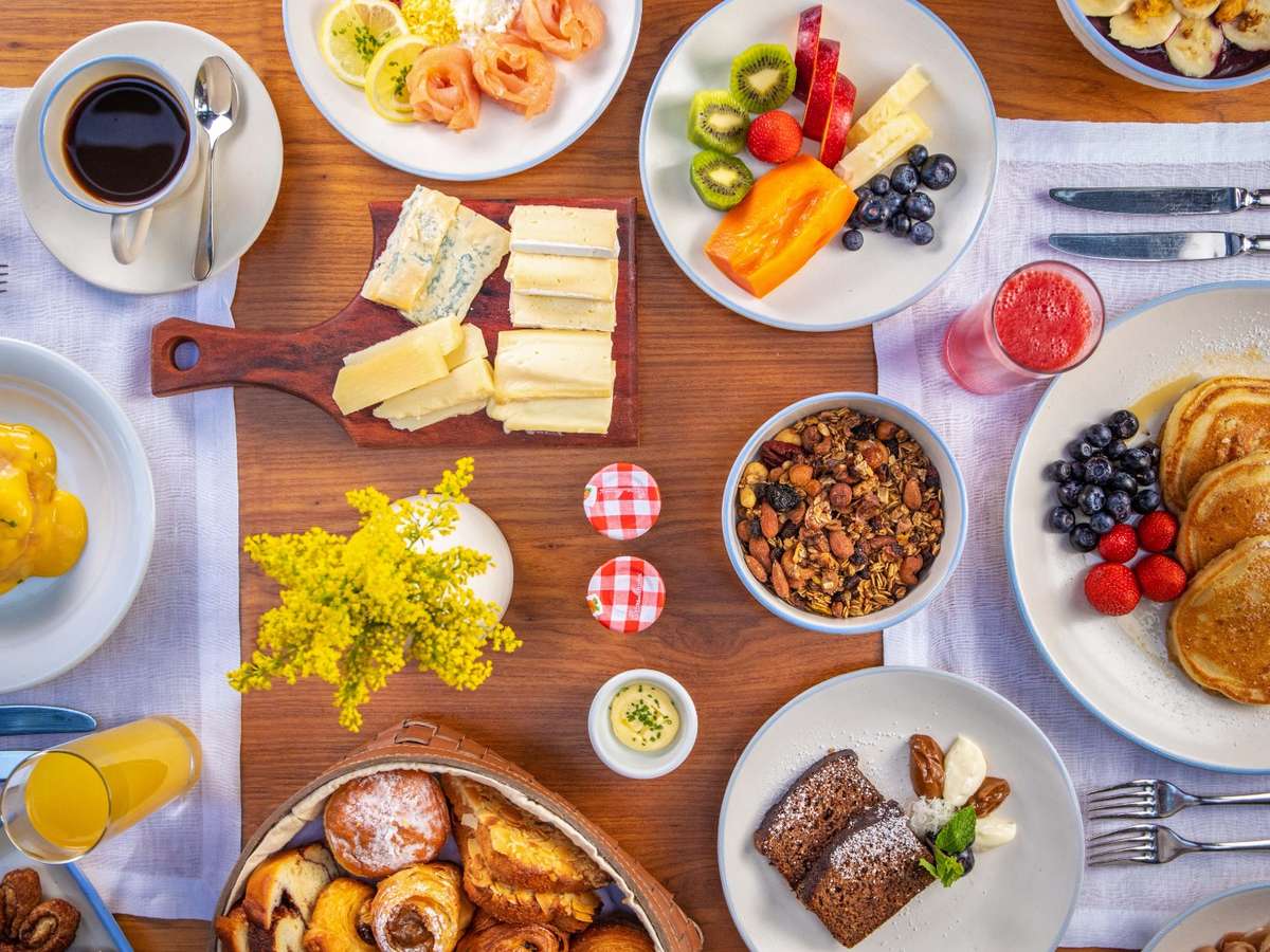 No cardápio há ainda pão de queijo de tapioca, pão de mel com cobertura de chocolate, granola e iogurte feitos na casa, frutas frescas da estação, diferentes tipos de leite - incluindo veganos e sem lactose, geleias, compotas, requeijões, frios e queijos selecionados.