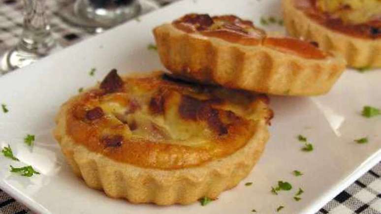 - Divida a massa em 12 porções e abra com os dedos em formas de miniquiche até que fiquem finas.
