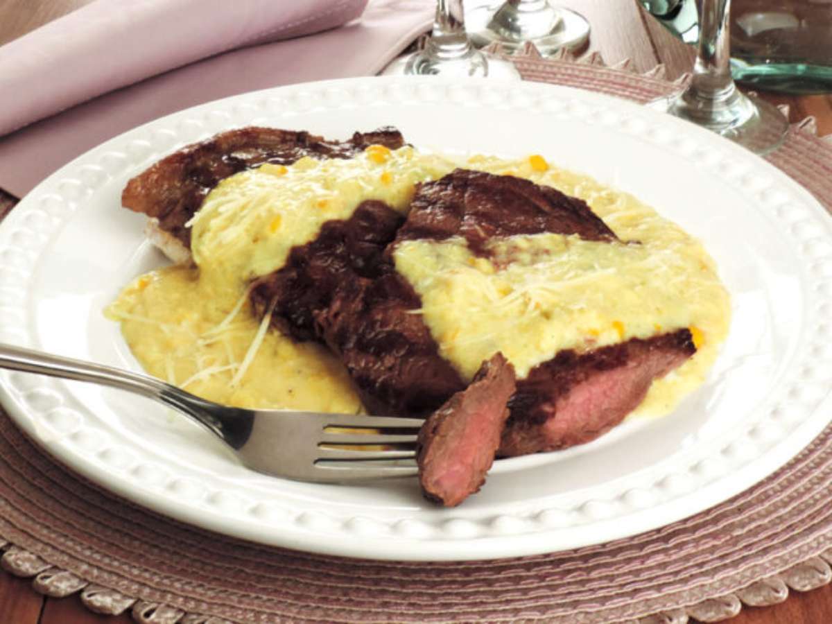 Aqueça uma frigideira grossa com o óleo e grelhe os bifes até dourar dos dois lados. Tempere com sal, pimenta e disponha em uma travessa. Regue com o creme de milho, polvilhe com parmesão e sirva em seguida.